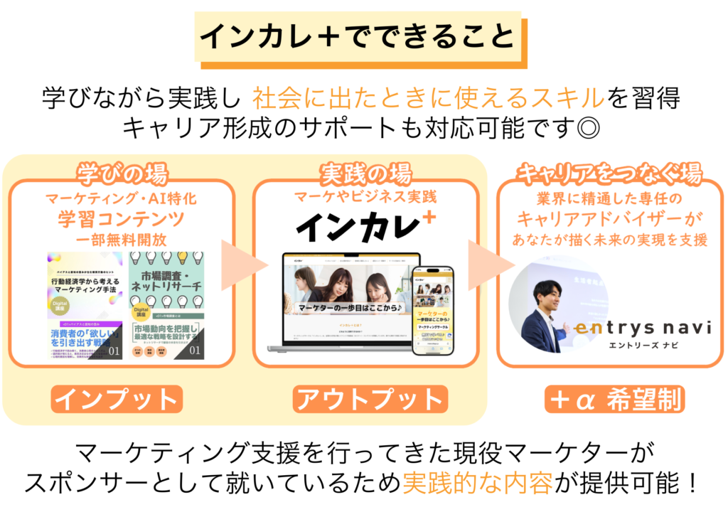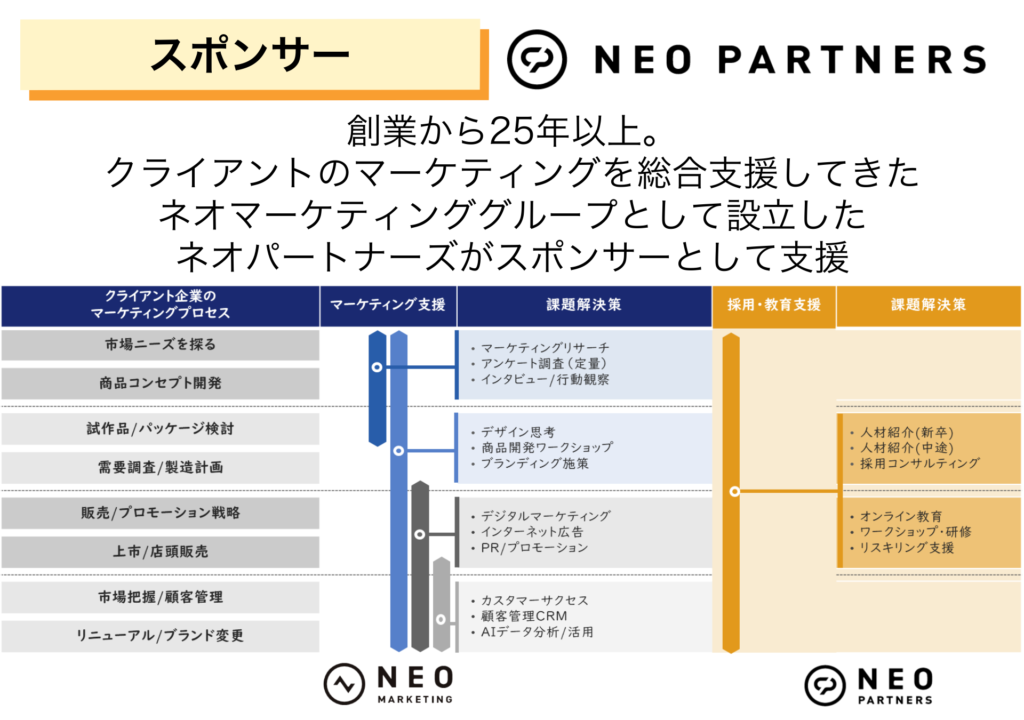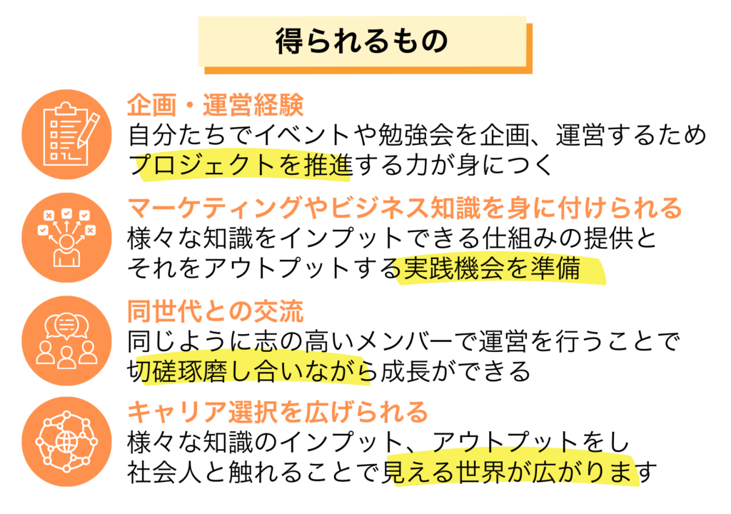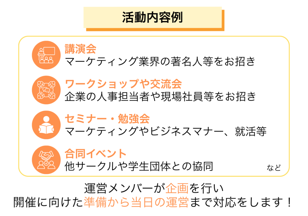 スポンサー企業の現役マーケッターなどをお招きして、お仕事のノウハウなどを教えていただける勉強会や、若手社員との座談会、参加者同士のグループワーク、プレゼンテーション、プチコンテストの企画なども手掛けていきます。